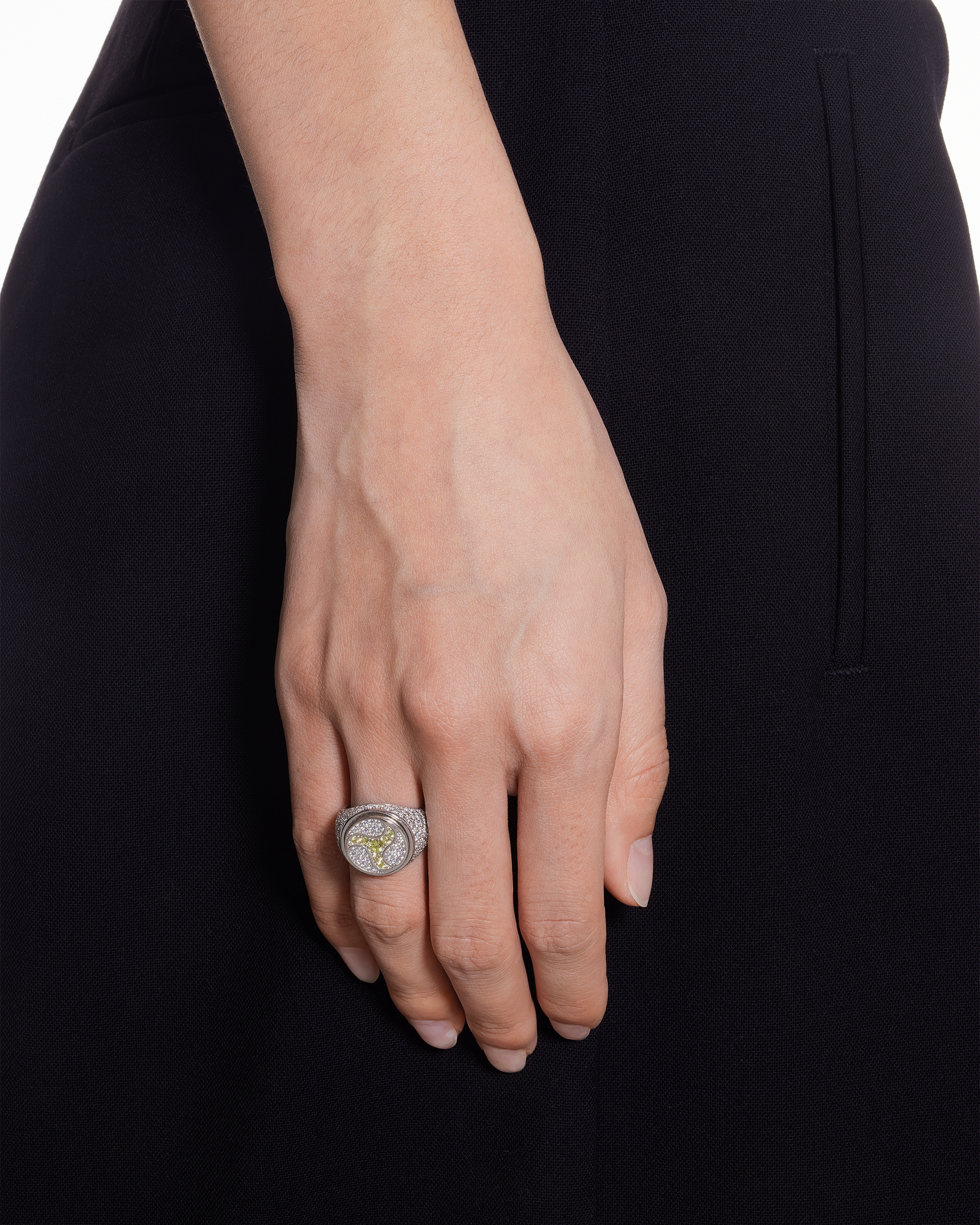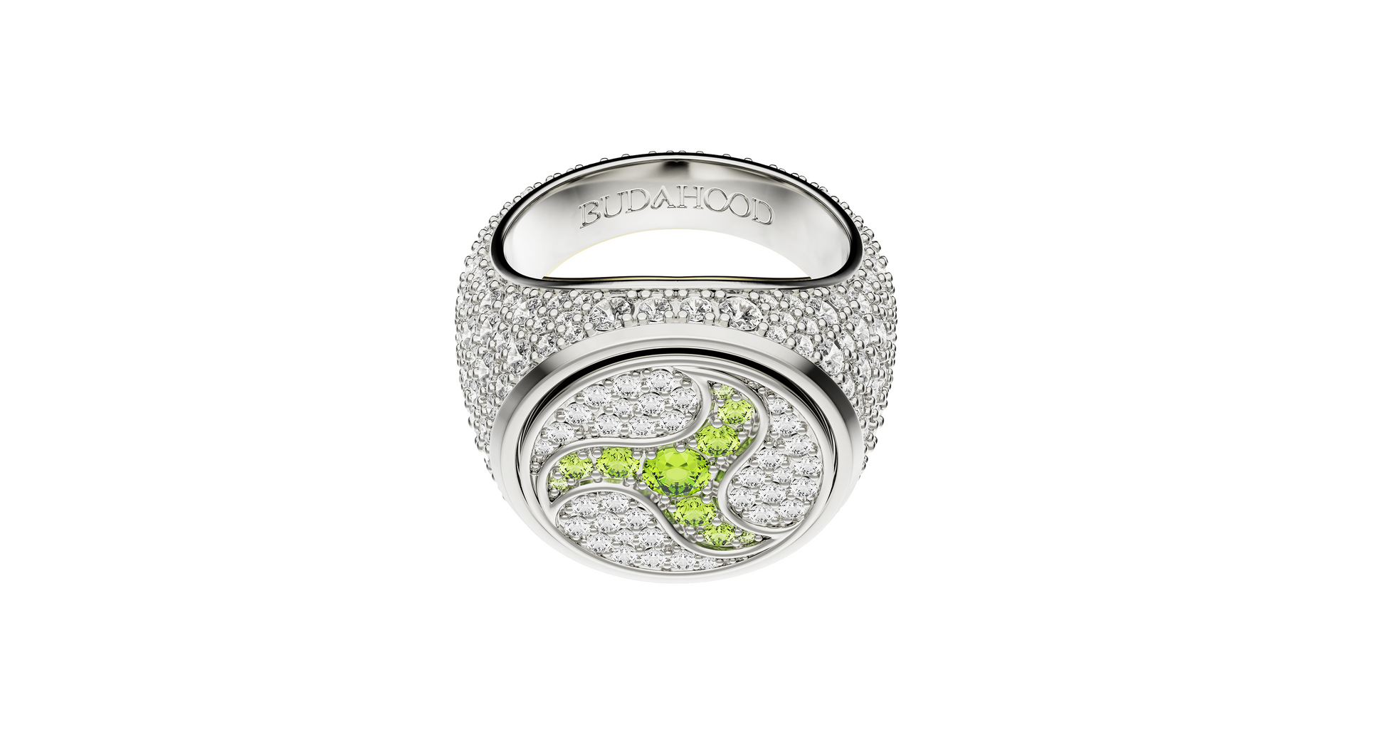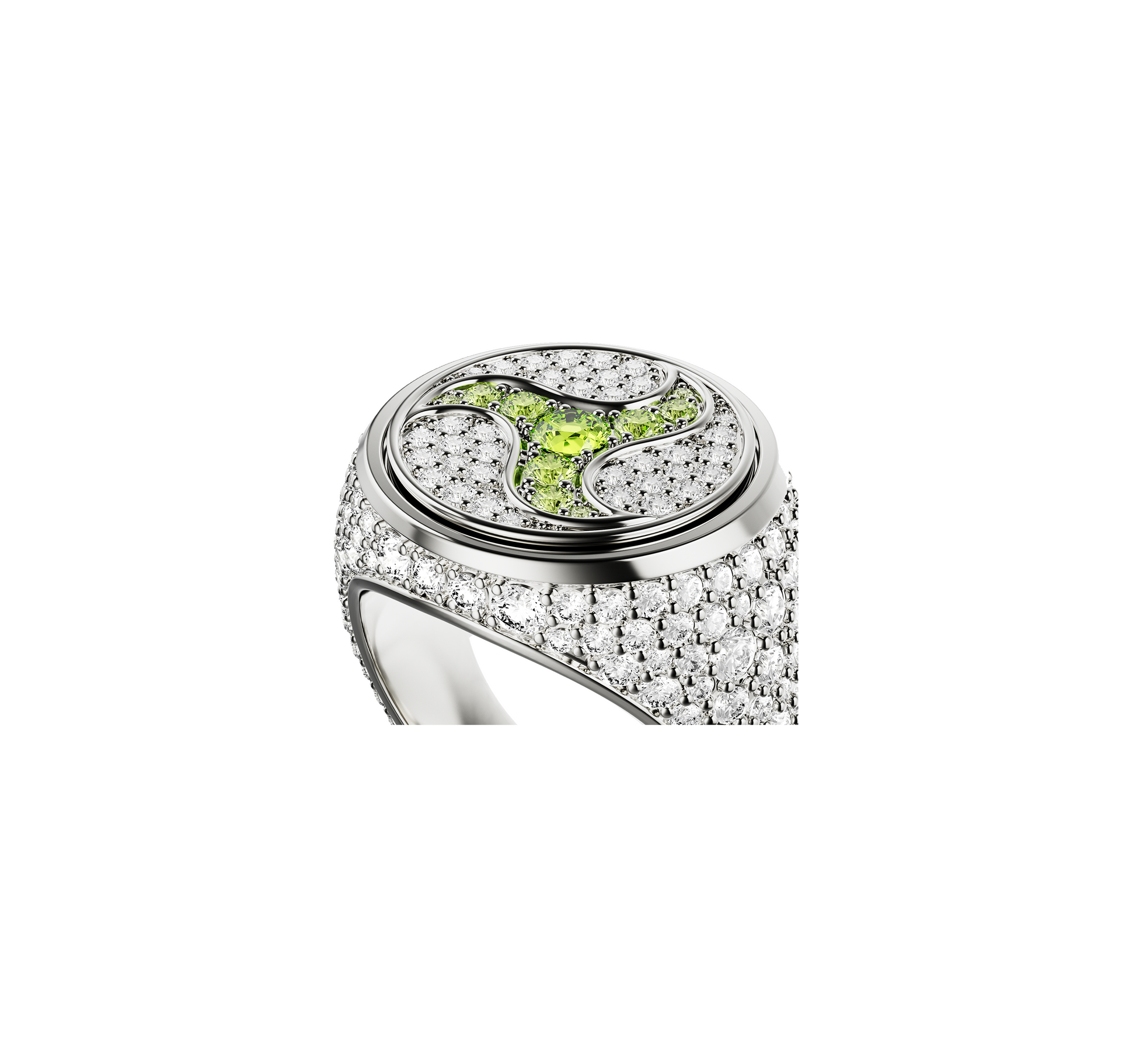 The Drip Wheel Of Joy Spinning Ring is crafted from sterling silver plated with 18K white gold. The ring is fully pavé-set with natural clear topaz and features natural peridot.