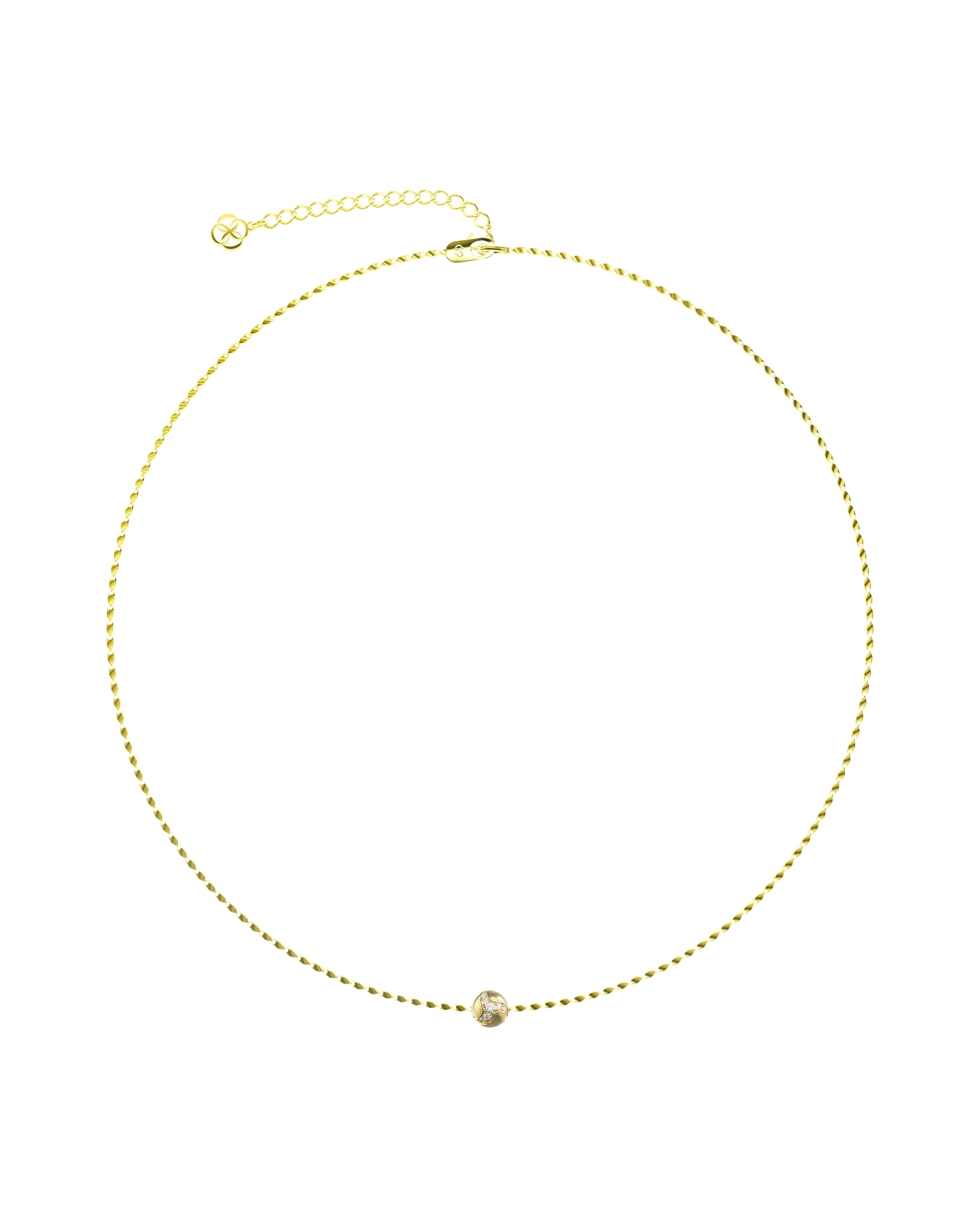 The 111 Dragon Ball Necklace is crafted from sterling silver plated with 18K yellow gold. The design features a diamond-cut shimmer chain with a central dragon ball pavé-set with lab diamonds,finished with a double infinity charm tag.