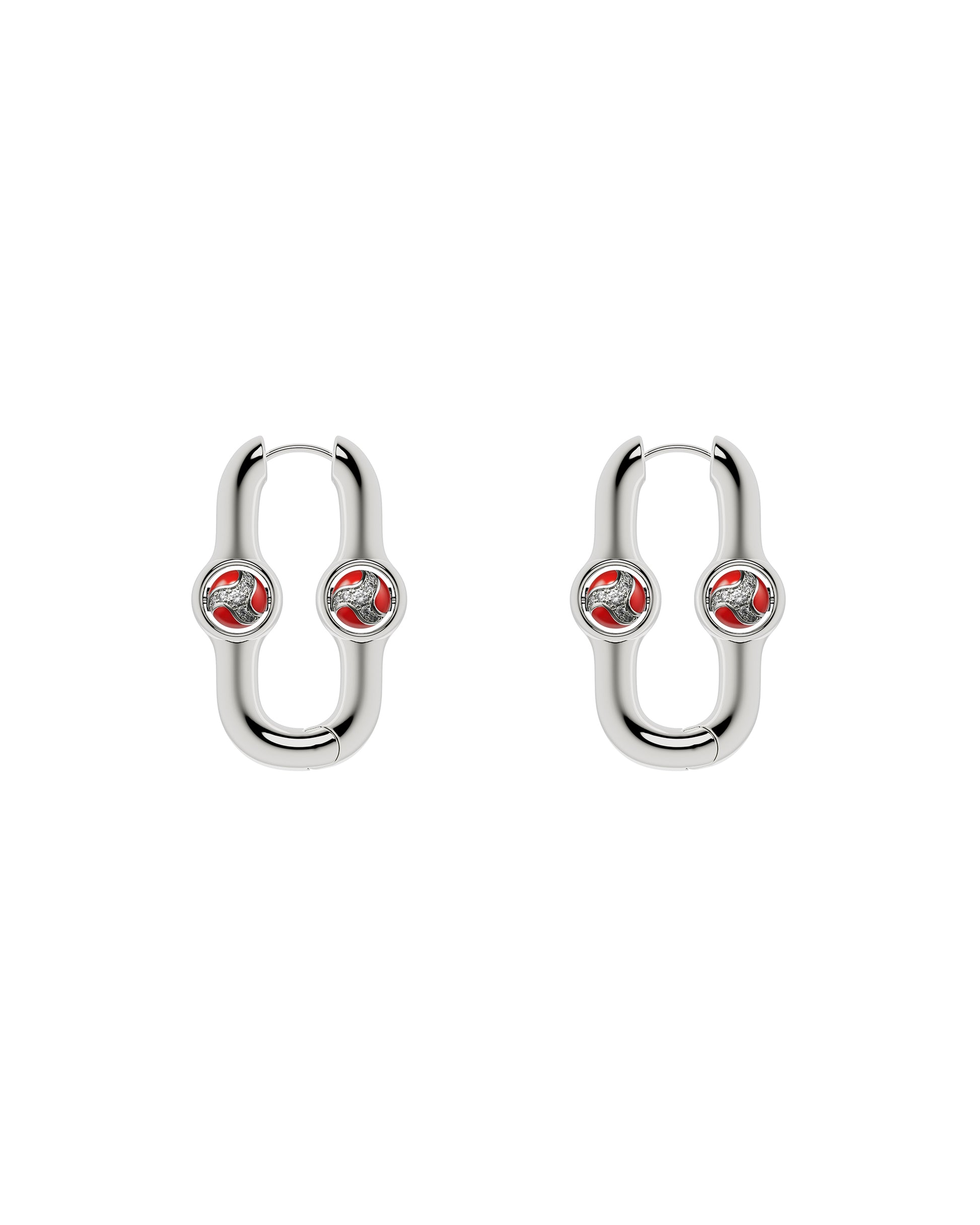 The Gate of Joy Earrings are crafted from sterling silver, plated with 18K white gold and pavé-set with zirconia, featuring vibrant red enamel accents.